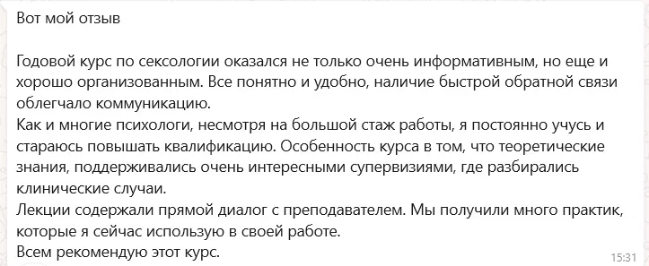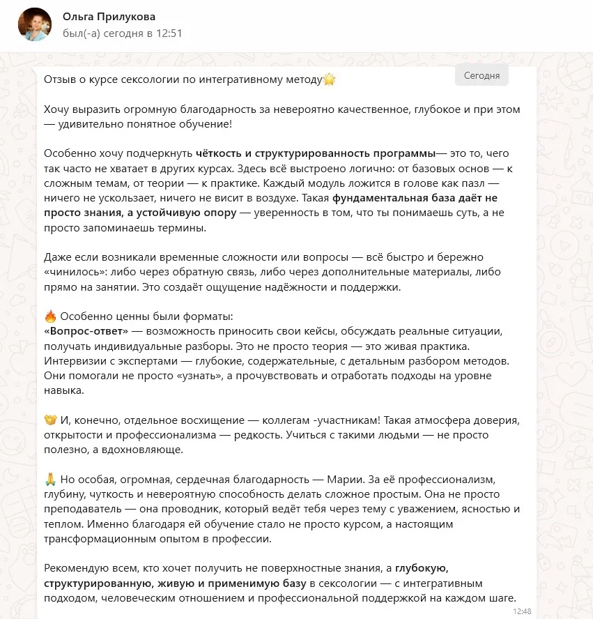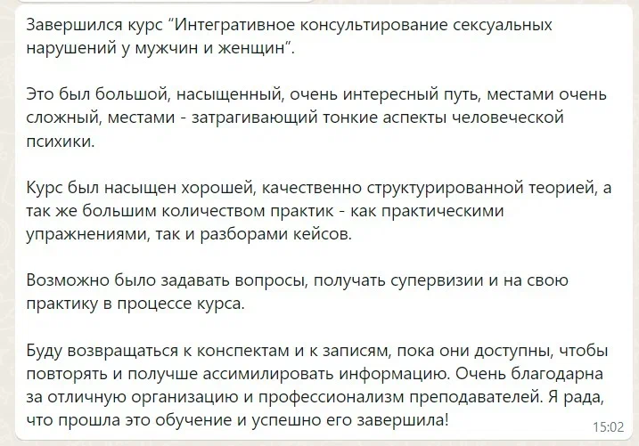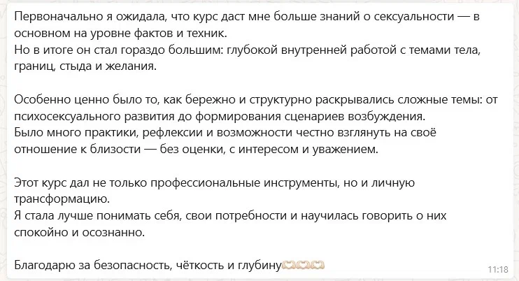 «Это было первое обучение, где о сексе говорят без давления, без неловкости, без подмены понятий — просто по-человечески и точно.»