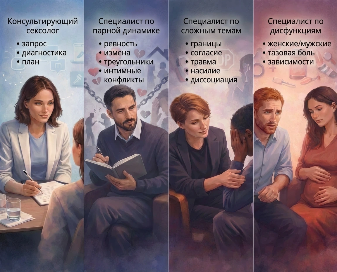 Большинство психологов не имеют медицинского образования — и это нормально. Однако, сексологические запросы требуют клинической грамотности: важно понимать, где достаточно психологической работы, а где нужна врачебная диагностика и маршрутизация.