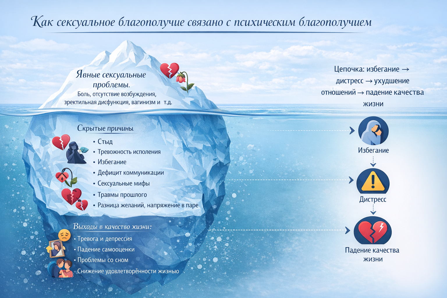 • Освоите работу с распространёнными запросами: снижение желания, тревога, стыд, избегание близости, дисфункции, боль, трудности в паре.
